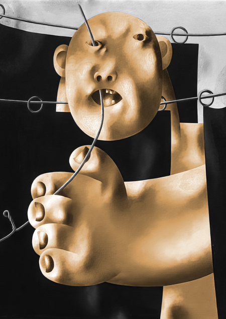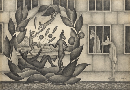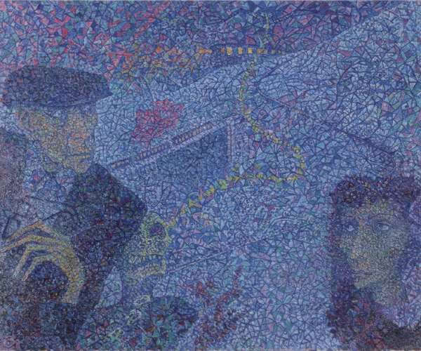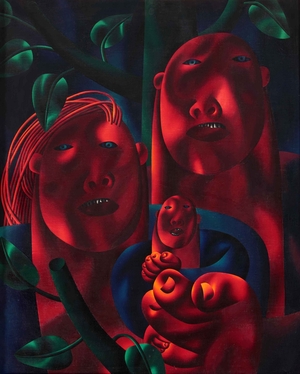 Герои, изображенные художником в статичных композициях, решены почти что геометрически, собраны из примитивных форм и даже стандартизированы, однако причудливая, многослойная техника исполнения не просто оживляет персонажей, а делает их приземленные на первый взгляд образы («Девочка и корова») таинственными и отчасти пугающими, наделяет картины пространством для личных интерпретаций.