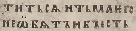 Пантелеймоново Евангелие, XII–нач. XII, РНБ Соф. 1. Знак с явным наклоном влево, при прямом стабильном ритме других букв