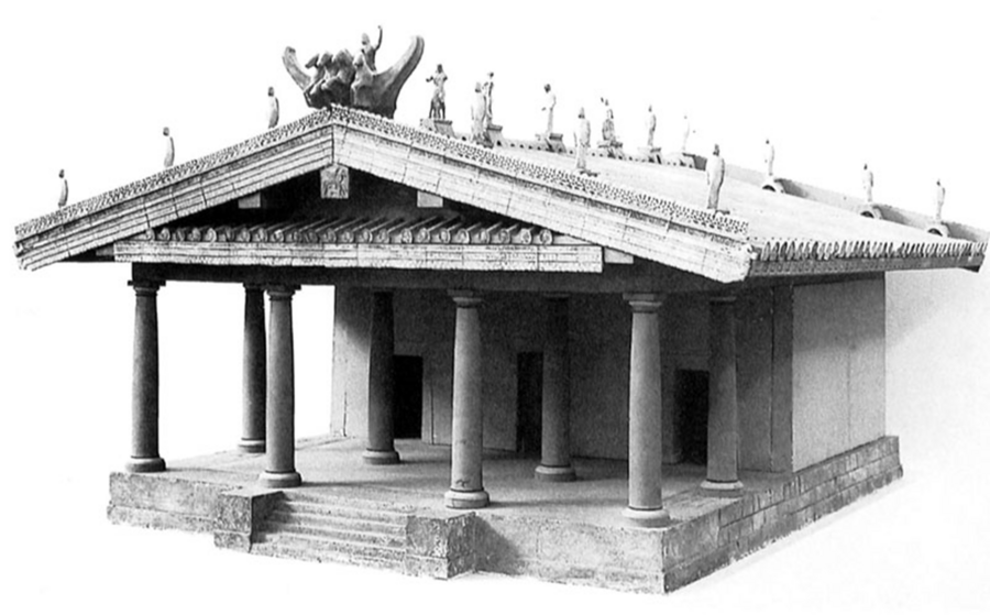 Крыша храма была двускатной и украшалась терракотовыми скульптурами. Храм часто стоял на высоком подиуме, и доступ к нему осуществлялся через лестницу. Эти особенности оказали значительное влияние на развитие римской архитектуры.
