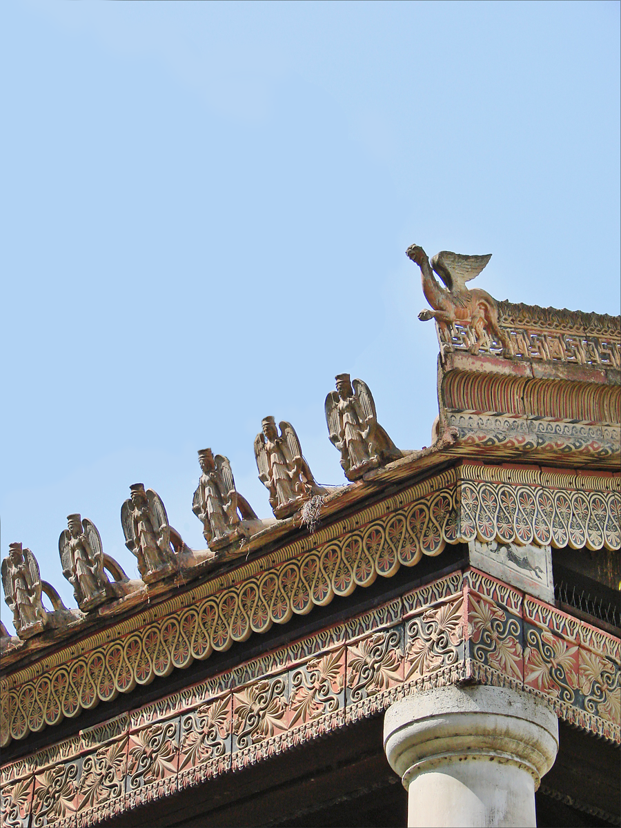 Греку эта постройка показалась бы лишенной всякого баланса: отсутствие антаблемента создает ощущение, что храм строили снизу вверх, и решили не завершать должным образом, а просто «кинули крышу» плоским блином прямо на капители колонн.