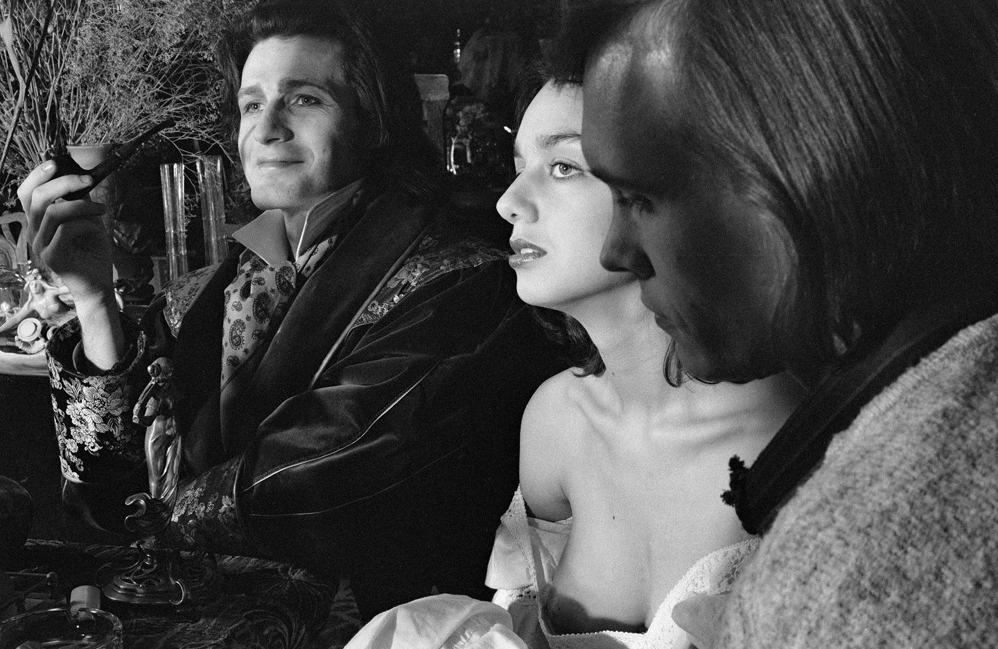Юрий Рыбчинский «В мастерской Симоны Сохринской — Дмитрий Пригов, Всеволод Некрасов», 1980-е // Сергей Борисов «Агузарова с юношей», 1987 год