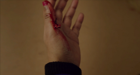 Кроме того, сами навязчивые образы выполнены в формате реальной съемки — с человеческими руками и предметами. Несмотря на то, что кровь и импакт от острых предметов очевидно добавлены с помощью 3Д в пост-продакшне, так как сами сцены выглядят фотореалистичными, это усиляет эффект опасности и не выбивается при этом из общей стилистики.