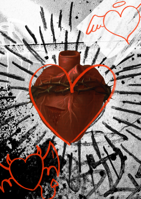 В XIX веке, с развитием печатных технологий начали выпускать религиозные открытки и постеры, содержащие проповеди, молитвы и символику. Особое внимание привлекает стилистика композиций, где визуальные элементы, включая текст и изображения, верстались в форме сердца, что подчеркивало эмоциональное и духовное значение символа в массовой культуре.