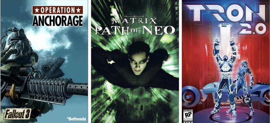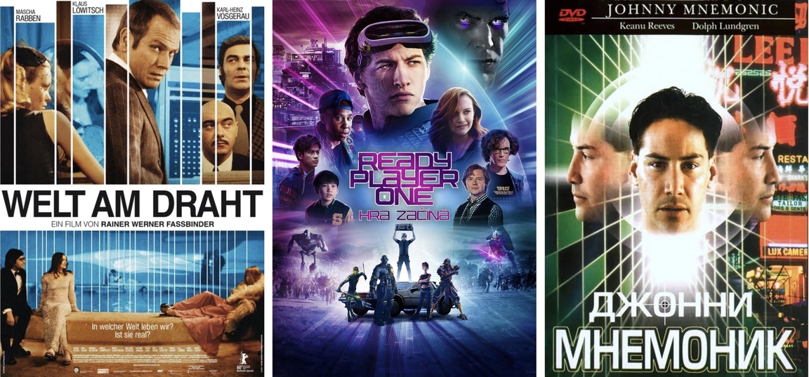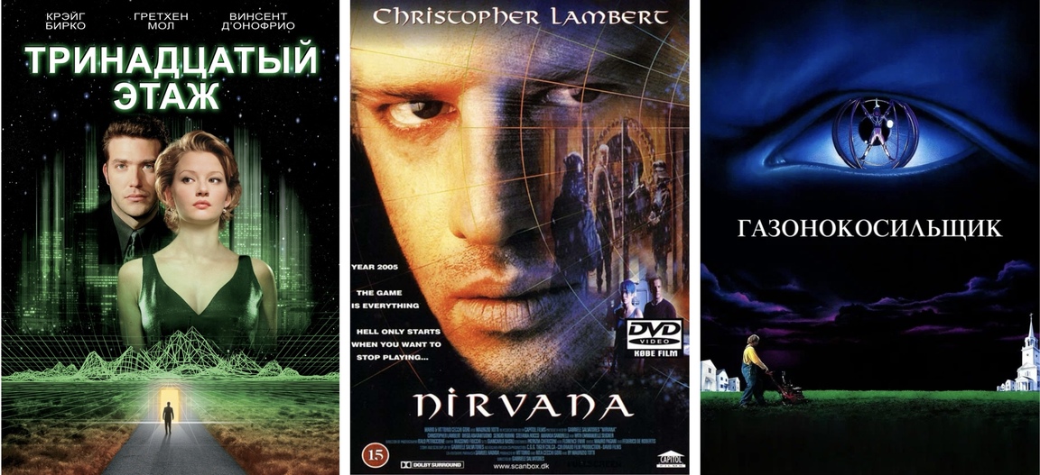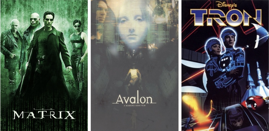 Обложки фильмов «Матрица», «Авалон», «Трон», «Тринадцатый этаж», «Мир на проводе», «Нирвана», «Газонокосильщик», «Первому игроку приготовиться», «Джонни Мнемоник».