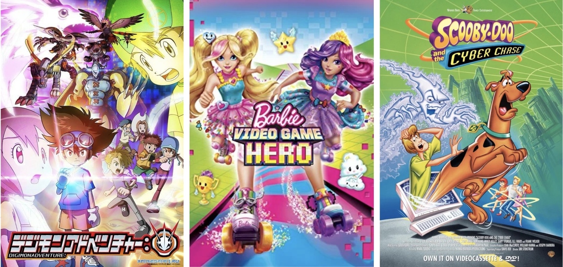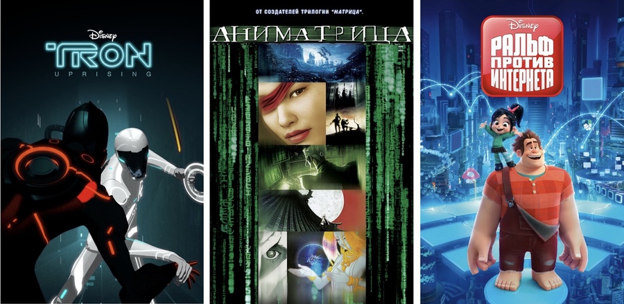 Обложки мультфильмов «Трон: Восстание», «Аниматрица», «Барби: Виртуальный мир», «Красавица и дракон», «Летние войны», «Приключения Дигимонов», «Ральф против интернета», «Скуби-Ду и киберпогоня».