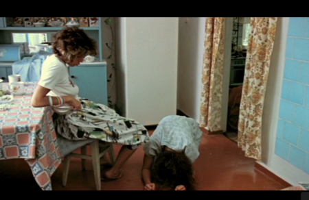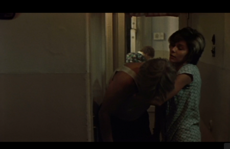 Почти все действие фильма происходит в тесных, низких, перегруженных деталями интерьерах, либо в местах скопления толпы. Камера часто располагается в дверных проёмах, узких проходах, где герои вынуждены буквально протискиваться мимо друг друга. Эта визуальная теснота отражает социальную и эмоциональную несвободу персонажей: в таких квартирах невозможно быть одному, наедине со своими чувствами. Эмоции здесь находят способ проявиться, герои действуют, но постоянно буквально"упираются» в непонимание друг друга.