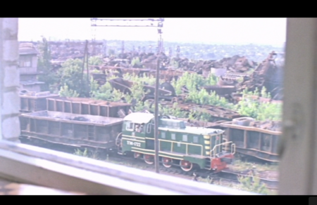 Перспектива кадров уходит вдаль, но пространство при этом кажется плоским из-за заводского смога. Пейзаж заполнен дымом и пылью.