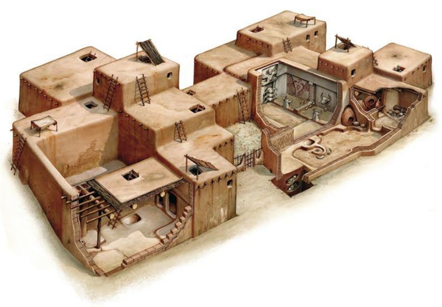 Чатал-Хююк можно считать первой коммуналкой на евразийском континенте. Встык расположенные друг к другу пространства комнат, стены которого выложены из сырца, предполагается, что вход выполнялся через крышу. Это одна из теорий, так как стены плохо сохранились, однако, мы можем судить о том, что пол комнат был выкрашен красным и украшен простым геометрическим узором.