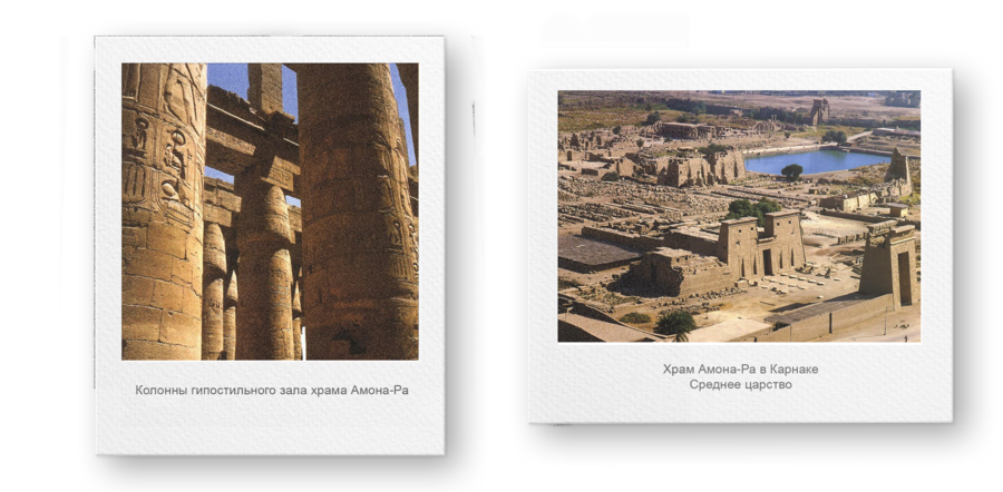 Древнеегипетская архитектура была насыщена символизмом, который отражался в каждой детали храмов. Потолки в храмах Среднего царства были разного уровня, и между ярусами были окна. В стенах окон не было, что создавало особое освещение внутри помещений.