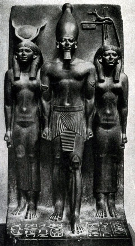 Фараон Менкаура, богиня Хатор и богиня нома. Скульптурная группа из заупокойного храма Менкаура в Гизэ. Пер. пол. 3 тыс. до н. э.