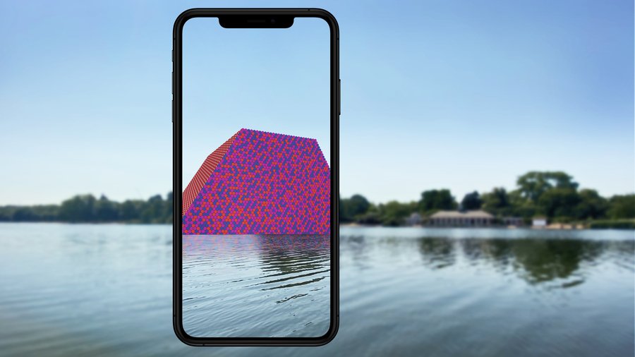 В 2020-м году дуэт художников Кристо и Жан-Клод в рамках коллаборации с цифровой галереей Acute Art выпустили AR-версию собственной инсталляции «Лондонская мастаба». Формально оригинал работы представлял собой пример актуального развития того, что Квон определял как объекты искусства в общественных местах (Квон, 2013), — временная масштабная инсталляция, расположенная на озере Серпентин в Гайд-парке. Собранная из нефтяных бочек, соединенных полиэтиленом, она балансировала между чисто декоративым объектом, примером очередного эксперимента с материалом и высказыванием на тему экологии. На практике цифровой двойник не мог похвастаться масштабностью оригинала, но оказался куда более экологичным с точки зрения производства.