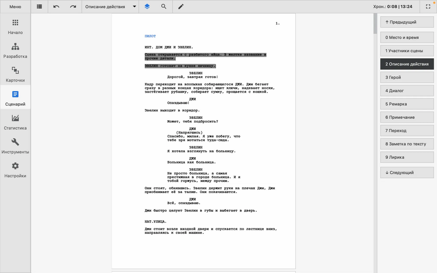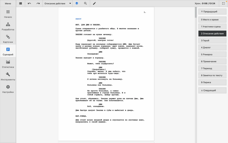 - Сценарий пишется в настоящем времени: "Он открывает дверь.» - Кратко и точно. - Новое действие — новый абзац. - При первом появлении персонажа имена выделяются заглавными буквами. - В KitScenarist прописывается с помощью функции «Описание действия».