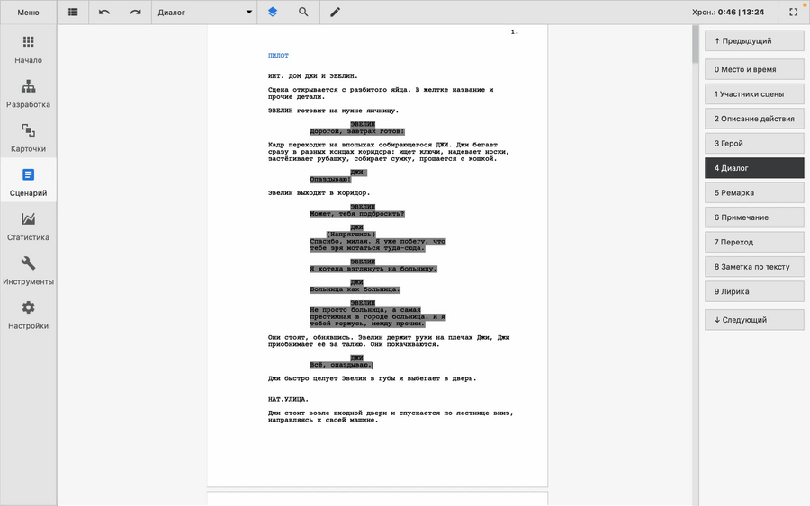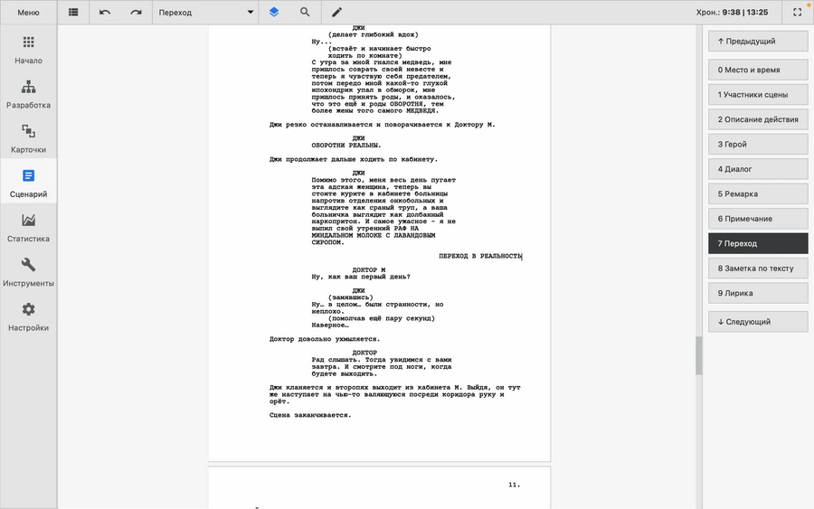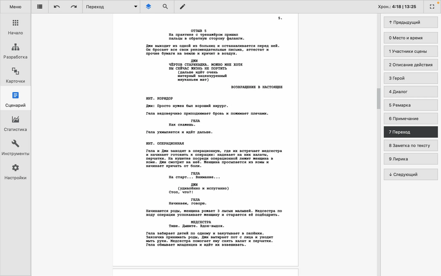 Выше были перечислены основные функции, использующиеся при написании сценария. Однако этим функционал программ не ограничивается. В KitScenarist можно заметить ещё несколько функций: