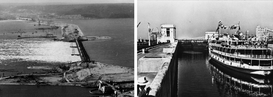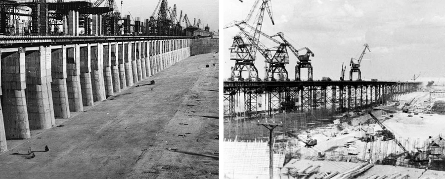 1.Жигулевская ГЭС, Самарская обл., Россия, строительство в 1949–1957 гг. // 2.Куйбышевское водохранилище, наполнение в 1957 г.