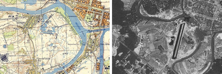 1.Гребной канал, г. Москва, РСФСР, строительство в 1973 г. (арх. В. Кузьмин, В. Колесник, И. Рожин, А. Ястребов) // 2.Территория до строительства в 1968 г. // 3.Территория после строительства в 1980 г.
