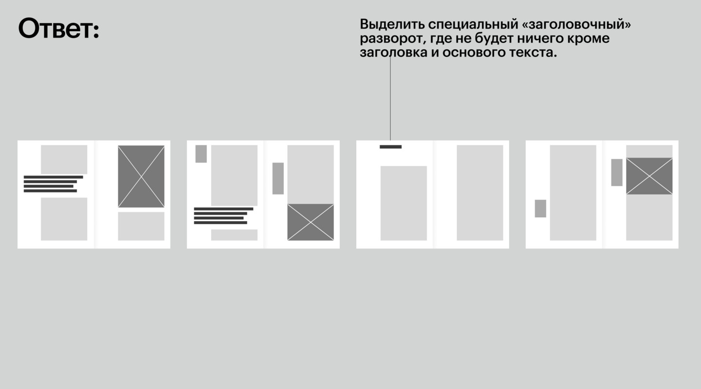 Для дизайнера это повод обратить внимание на оформление заголовков каждой из этих единиц. Будет ли понятно читателю, что перед ним — начало крупного раздела или лишь подглавка внутри одной главы, — это вопрос функции. А как сделать заголовки выразительными, не будучи при этом скучными и предсказуемыми, — это уже вопрос эстетики.