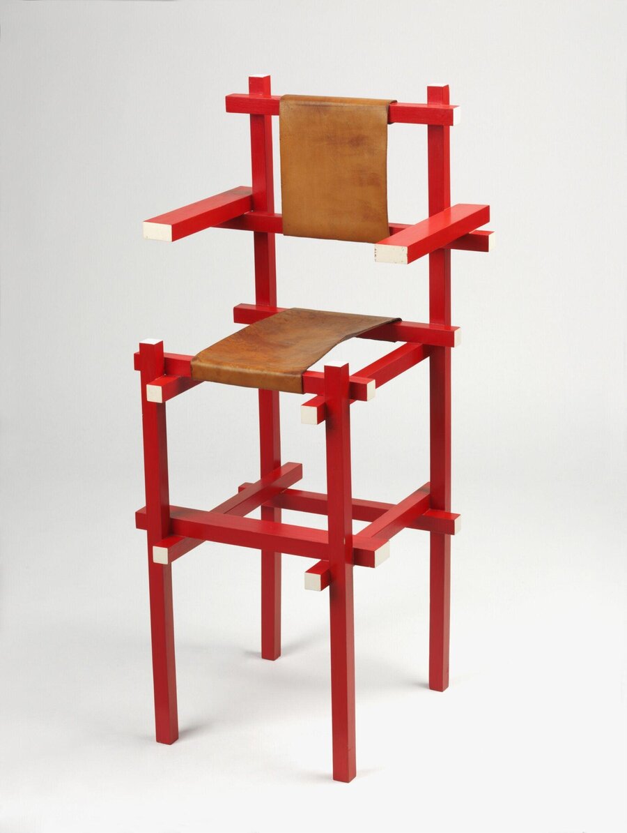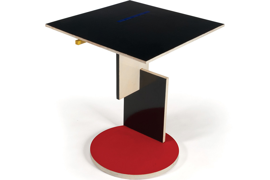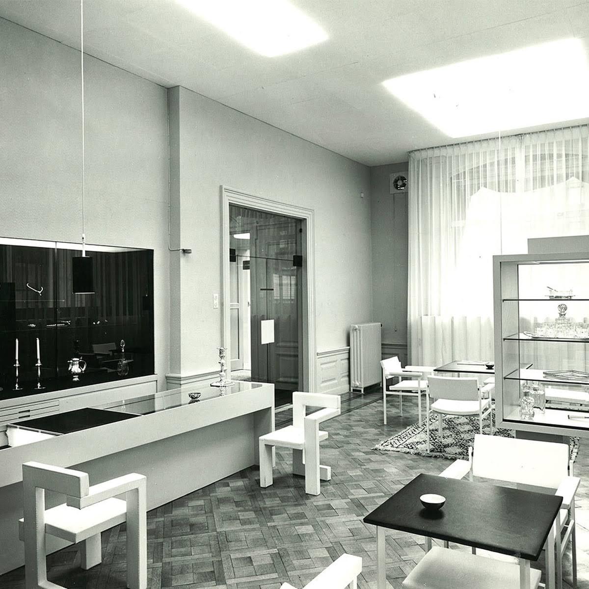 Геррит Ритвельд, детский стульчик для кормления, 1920; Геррит Ритвельд, стул «Steltman chair, 1963; Интерьеры ювелирного магазина Steltman, около 1963; Геррит Ритвельд, стол „End Table“, 1923