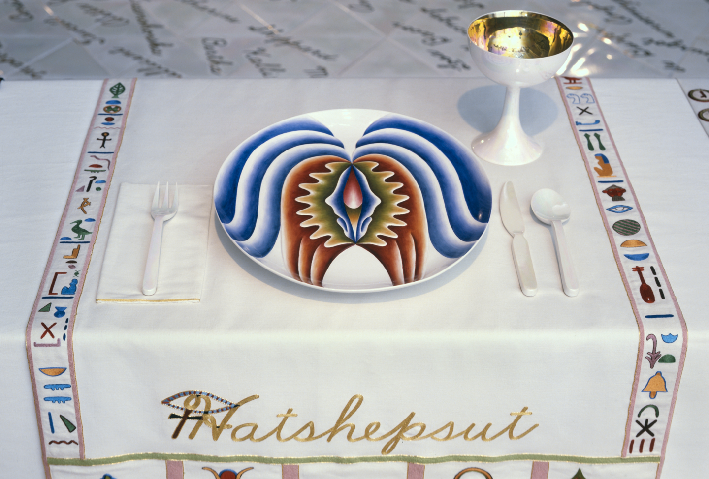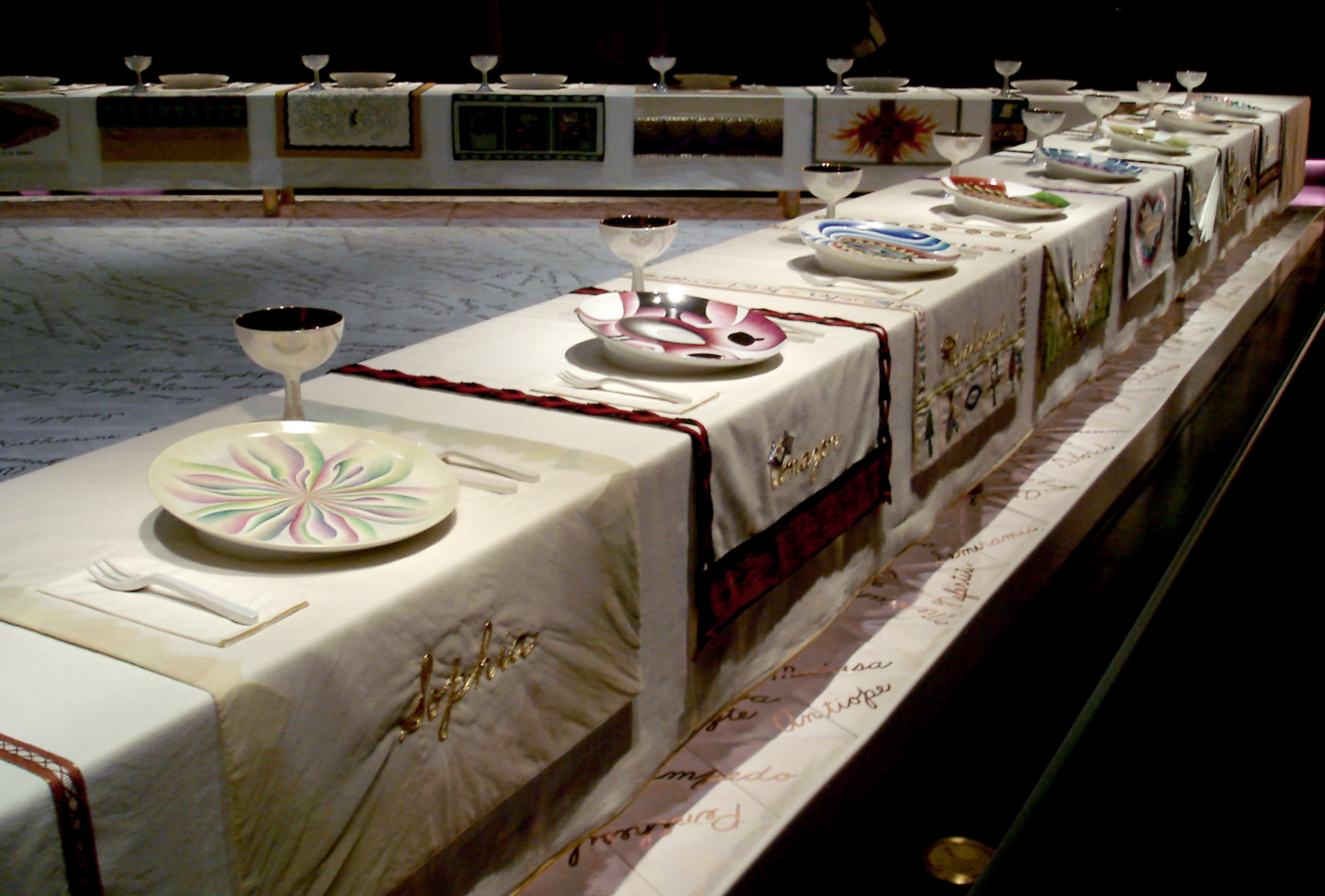 Джуди Чикаго, «Званый ужин» https://judychicago.com/gallery/the-dinner-party/dp-artwork/, https://smarthistory.org/judy-chicago-the-dinner-party/ https://www.dannywithlove.com/blog/about-judy-chicagos-the-dinner-party