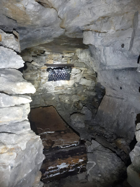 Вход в каменоломни из здания и одна из «комнат» каменоломен — Спальня / автор фото и год неизвестны