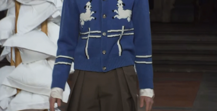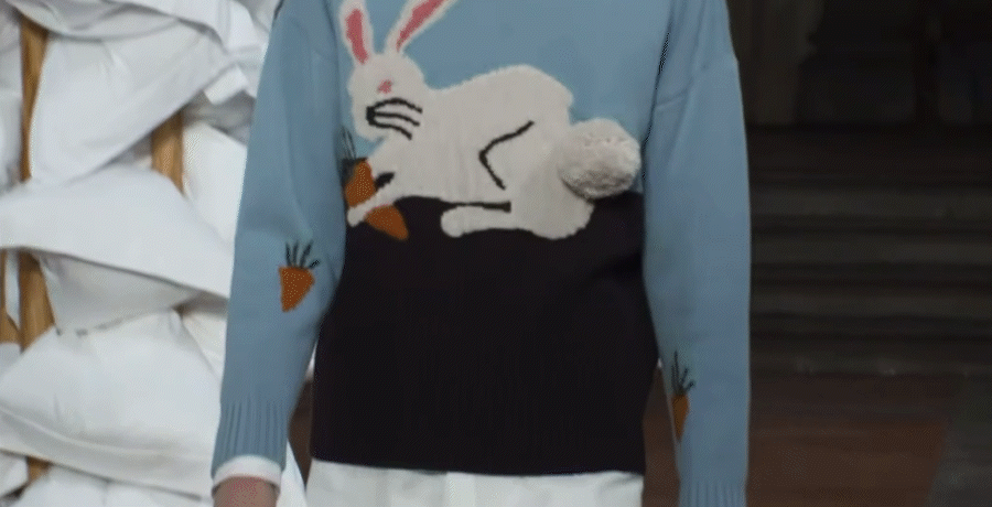 В работах дизайнера имеется множество отсылок к английскому саду: от использования в качестве сет-дизайна до добавления соответствующих декоративных элементов в костюм. Так, на свитерах начинают простираться холмы и луга, на которых пасутся овцы.