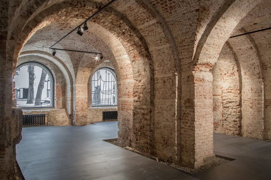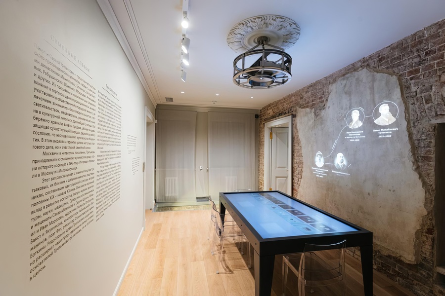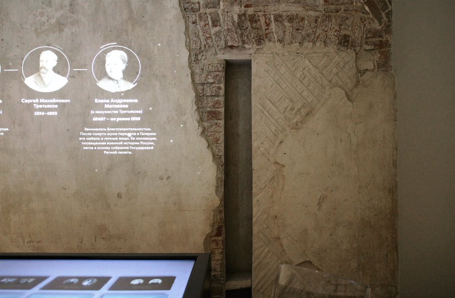 Дом братьев Третьяковых тоже обладает многослойной структурой. Он экспонирует не только музейную коллекцию, но и собственную историю, отраженную в раскрытой кирпичной кладке с клеймами, оригинальной штукатурной дранке и застекленном подвале. Дизайн экспозиции получился современным, благородным и правдивым: муляжи, нужные для реконструкции обстановки, выполнены в сером цвете, что позволяет сохранить ценность подлинности.