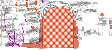 36. Флигель «Руина» Музея архитектуры имени А. В. Щусева, Россия, конец XVIII в. / 2017, RDNK. Картограмма дефектов и рекомендации по противоаварийным и консервационным работам, из альбома чертежей.