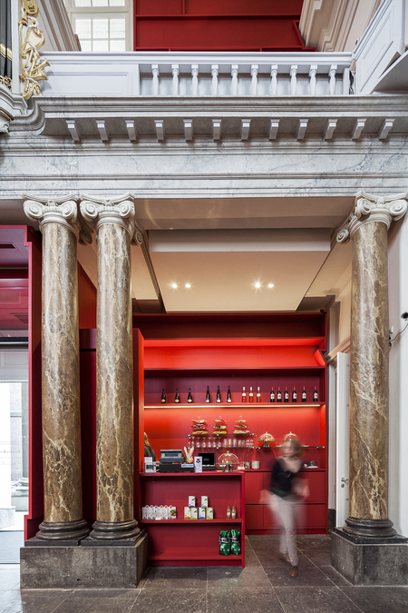 Еще один яркий пример почтительного обновления — музей современного искусства в Схидаме. Вестибюль был перенесен из подвала в заброшенную неоклассическую часовню, которая является центральной частью комплекса. Интегрированные конструкции легкие и простые, что позволяет разобрать их в любой момент, сохранив строгий и торжественный исторический интерьер нетронутым. Ярко-красные элементы контрастируют с холодным фоном и напоминают о сакральном характере сооружения.