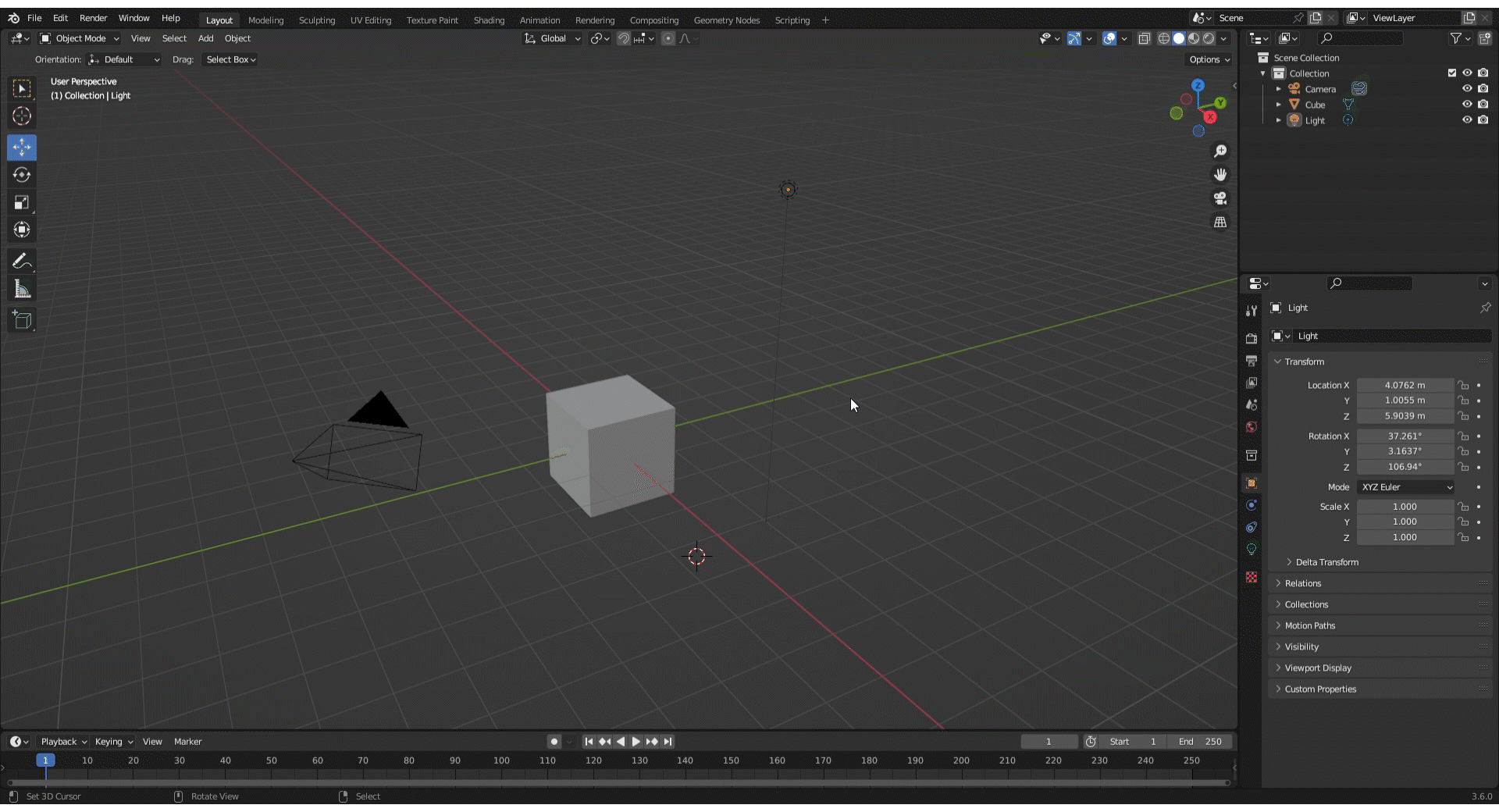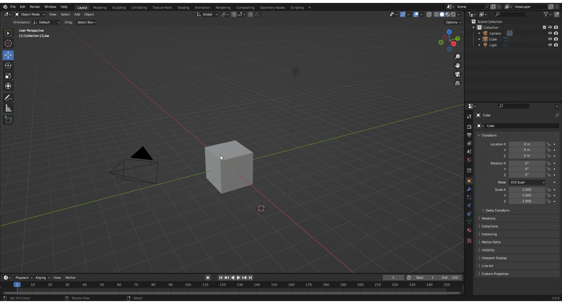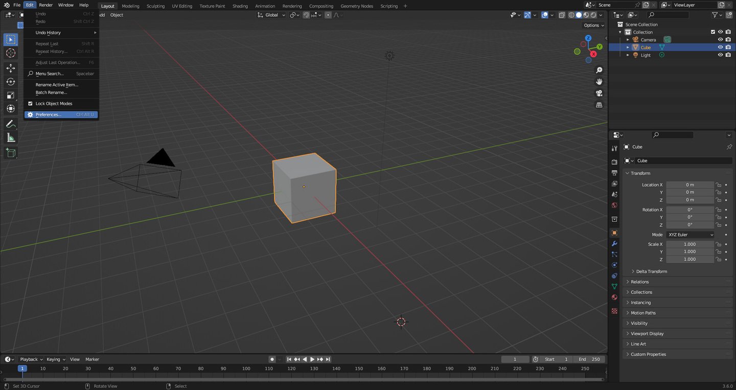 Viewport — 3d-пространство, внутри которого хранится и редактируется модель. В нашем случае это пока что базовый куб, камера и лампа как источник света.