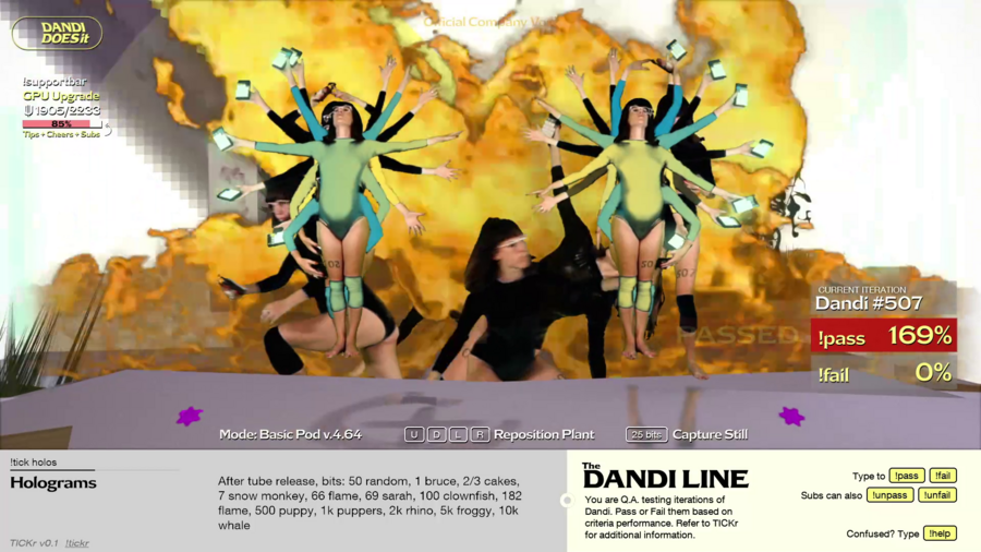 А это новаторский проект на платформе Twitch, разработанный Данди Уинд Опейном и Матией Эрчегом в 2021 году во время пандемии COVID-19. Он сочетает в себе элементы перформанса, интерактивного повествования и 3D-анимации, предлагая уникальный опыт для зрителей. Сюжет разворачивается в футуристическом сеттинге 3021 года, где Данди играет различных клонов самой себя в каждом эпизоде. Зрители принимают на себя роль тестировщиков качества для «Компании», которая производит этих клонов, называемых «Offsets». Аудитория взаимодействует со стримом, решая, пройти или провалиться каждому клону на основе его выступления. Пройденные клоны продолжают свои судьбы, в то время как провалившиеся — деактивируются.