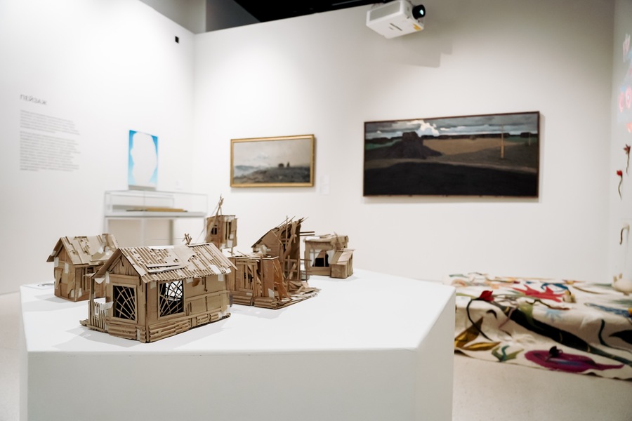 Три видеоинсталляции открывают зал, посвященный пейзажу (Ильясова Саргина, Елена Власова, Арт-группа «Крепость»). Они сразу задают тон, напоминая, что пейзаж для художника — это не просто отражение реальности, а художественный вымысел, сконструированный автором.