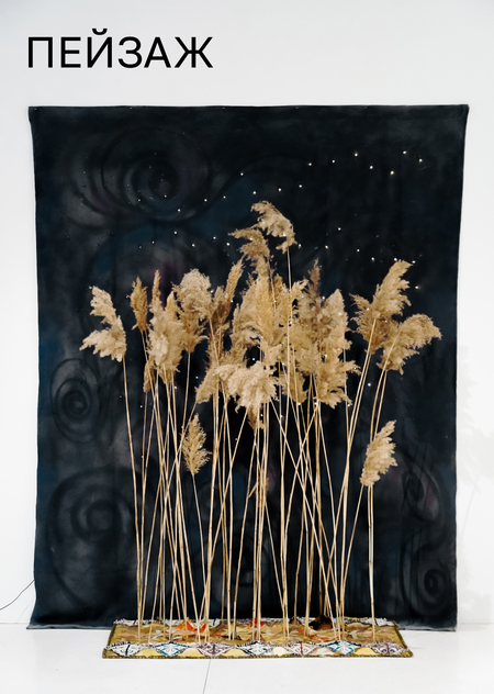 Центром инсталляции является собранный из этнических гобеленов и лоскутов ковер, как отражение многослойности человеческого опыта. Он хранит в себе послания и обереги в виде узоров. Камыши, проросшие сквозь его волокна, как очередной слой событий, напоминают о неоспоримой связи человека с природой. В ней согревающее и природное предстает на фоне глубокого и холодного космоса, такого вечного, неизменного. Быстротечная жизнь растения и чуть более продолжительный век человеческой культуры — всего лишь миг, в сравнении со звездами.