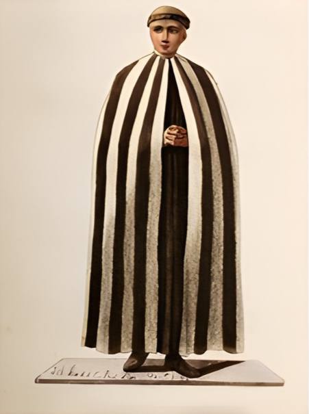 Миряне были обязаны носить одежды в полоску. Незаконнорожденные, слуги и осужденные. Проститутки, жонглеры, шуты и палачи обязаны были носить хоть что-то полосатое, будь то штаны, шапки или платья. Как я говорила ранее, это были изгои общества и у них не было выбора одежды. В литературе и в искусстве в целом негативный персонаж изображался в полосатой одежде. В книгах и картинах всегда описывались такие «меченые» люди, а именно негативные. Средневековые люди любили характеризовать людей в искусстве прямо. Плохой человек? Значит напишу его в полосатых одеждах. Например, Святой Иосиф в средневековье он был комичен, посмешищем. В сценах его изображали в основном деревенские дураки, одетые в полосатые одежды, а на фресках святой Иосиф обычно отдален от других. Конечно, позднее его признали святым и уважаемым, но факт остается фактом, в полосатом, значит какой-то…