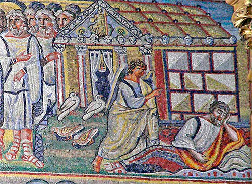 Явление Ангела Иосифу. 432-440 гг. Мозаика. Базилика Санта Мария Маджоре, Рим; Якопо Бассано (XVI век): полосатая одежда в центре картины намекает на отрицательный характер персонажа