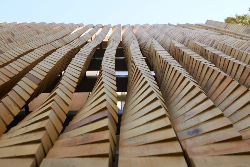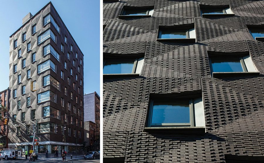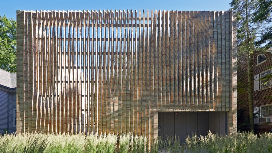 Непривычно развернутый кирпич создает необычный эффект, формируя новаторский облик здания.