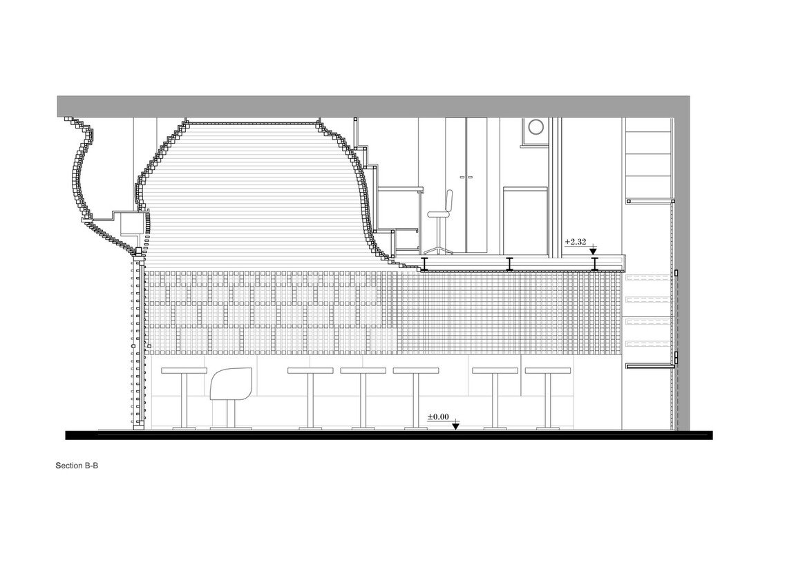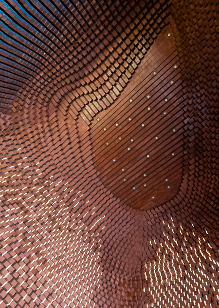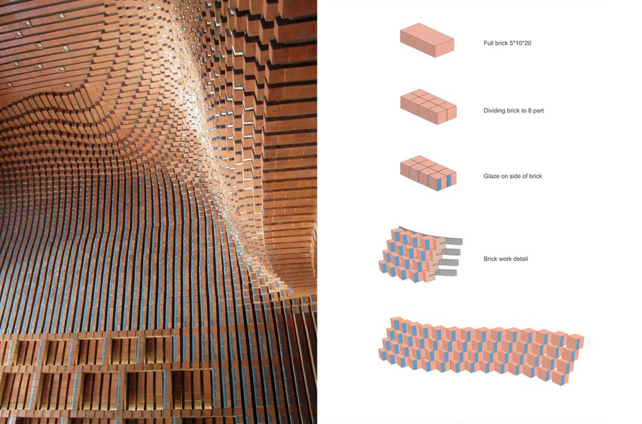 Архитекторы Hoobs Design, используя BIM (Building Information Model — информационная модель здания), создали интегрированную структуру, выполняющую все необходимые функции. Сложная гнутая форма из кирпича выполняет одновременно и роль фасада, и художественного оформления стен и потолка, и даже перекрытия пола помещения для персонала.