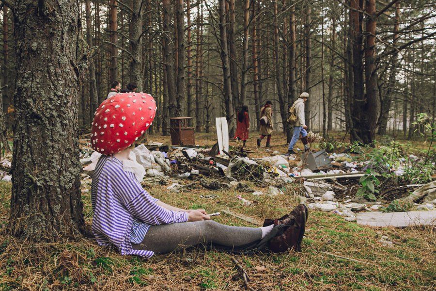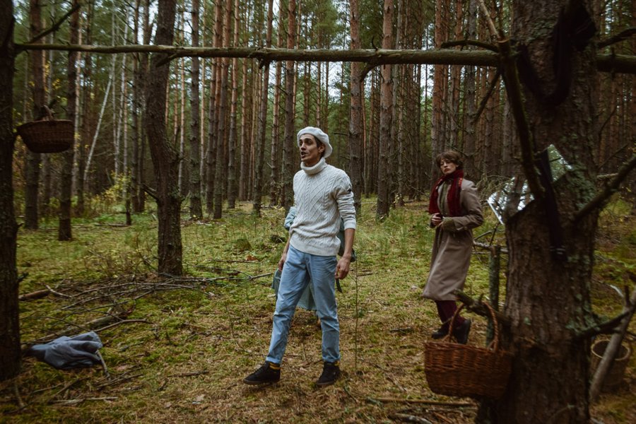 Похожим образом устроен спектакль «По грибы», где зрителям предложено совершить путешествие через реку в лес, где пространство постоянно преображается, а процесс сбора грибов приобретает сюрреалистические черты.