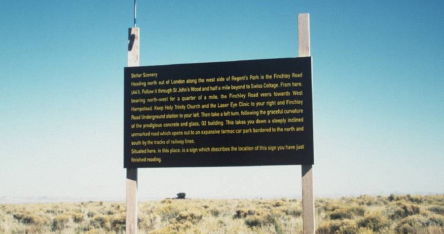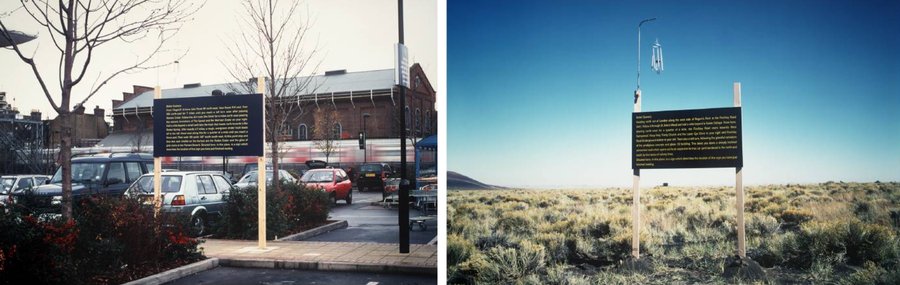 Скульптуры-баннеры Адама Чодзко, расположенные возле Лондонского торгового центра и в пустыне Аризоны соответственно, содержат в себе текст с описанием пути от первого объекта до второго и наоборот.