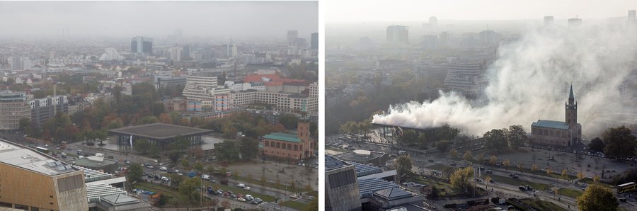 Обычно дым — признак пожара, но не в данном случае. Белые густые облака оформляют городское пространство, в движении скрывают одни его черты и выдвигают на первый план другие.