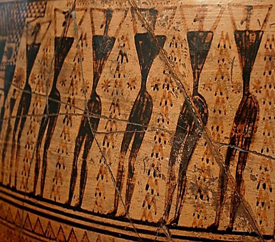 Геометрический период (IX–VIII вв. до н. э.) характеризуется строгими орнаментами, геометрическими узорами и стилизованными фигурами на керамике. Изображения человека схематичны и подчинены общей декоративной системе.
