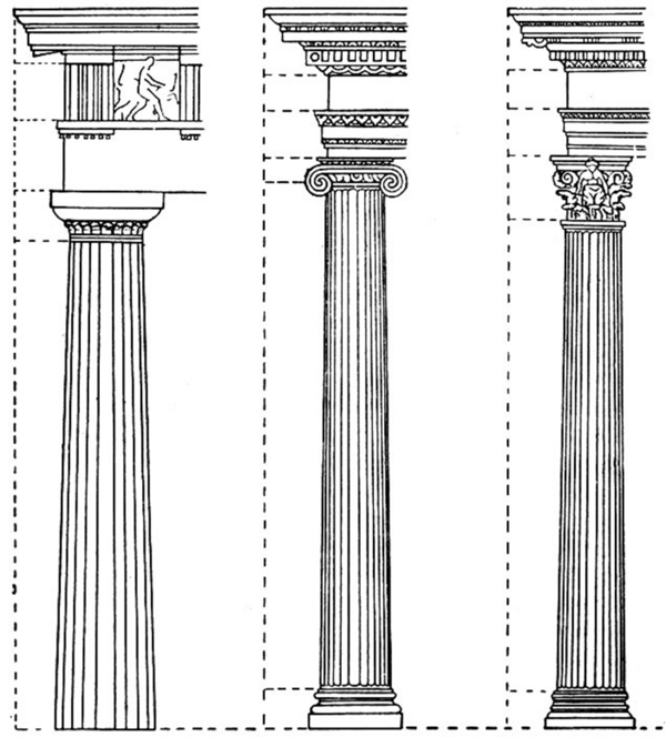 Дорический — строгий и тяжёлый, выражает силу, мужской образ. Ионический — лёгкий и утончённый, акцент на изящество. Коринфский — декоративный и пышный, используется для зрелищности, отличительная черта позднего греческого периода в искусстве.