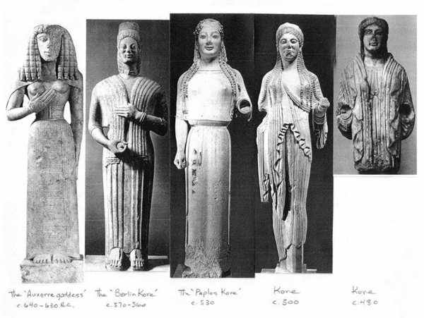 Основными типами статуй были куросы — обнажённые юноши, и коры — одетые девушки выполнявшие культовые или надгробные функции. Фигуры изображались в жёсткой фронтальной позе с одной выдвинутой вперёд ногой и с выражением так называемой «архаической улыбки», что придавало им условную живость.