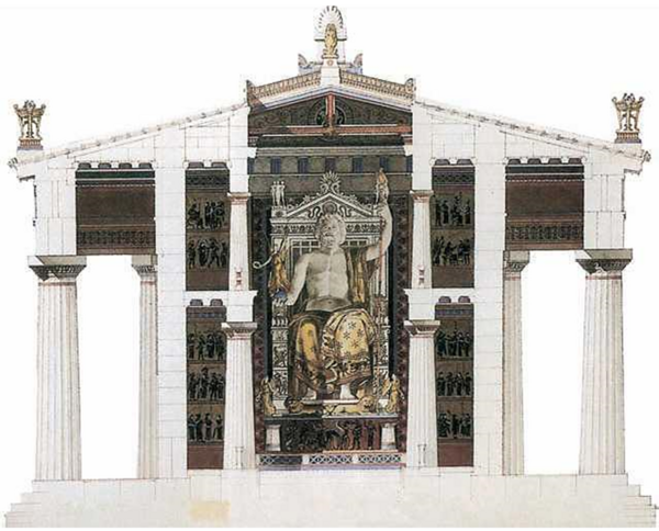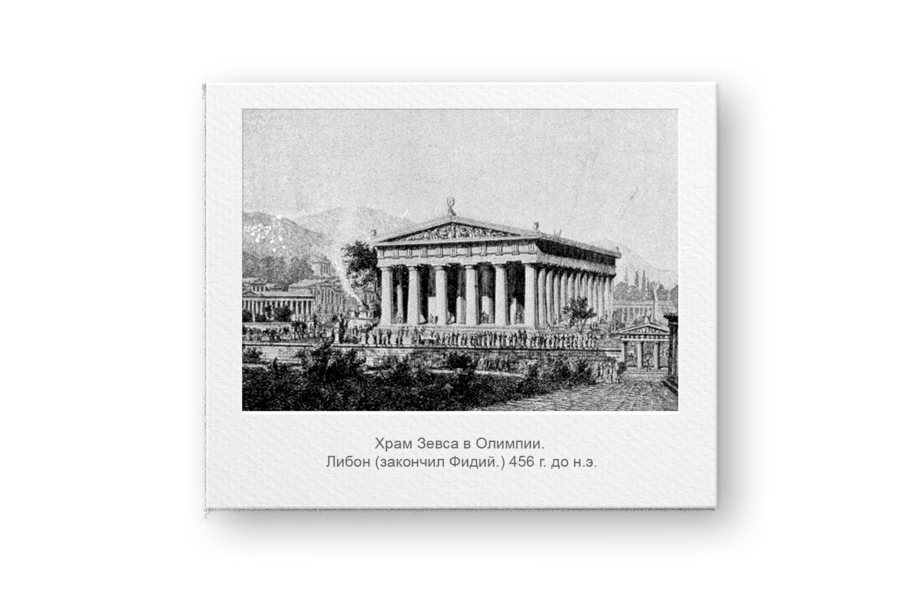Классический храм Зевса был заложен в 52 олимпиаду элейцем Либоном, но закончен только в период 85-86 олимпиад Фидием, то есть между 472 и 456 до н. э.