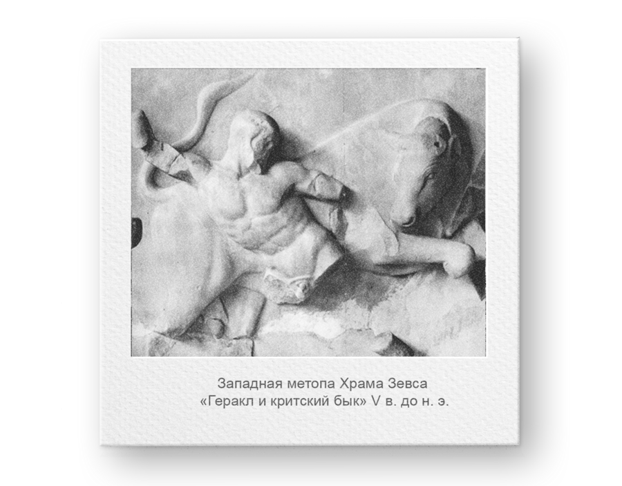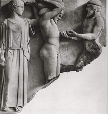 Метопа храма Зевса в Олимпии Геракл, Атлант и Афина. Около 460 года до н. э.