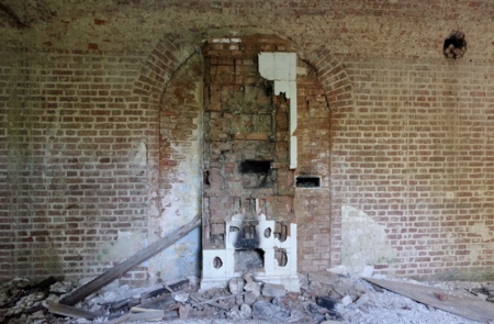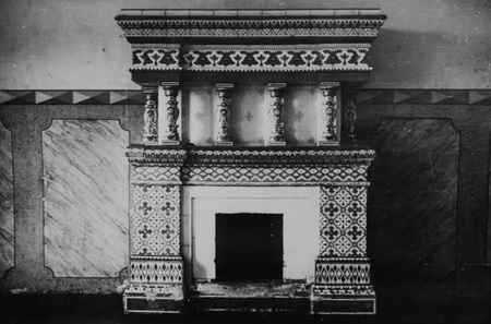 1. Камин в усадьбе 1900–1917 год (архивная фотография); 2. Разрушенный камин в усадьбе (фотография наших дней).