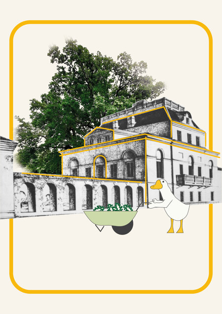 Перед графским домом находилась площадка с фонтаном и стоящей в нем скульптурой «Мальчика с гусем», автор коллажа: Анастасия Сосулина.
