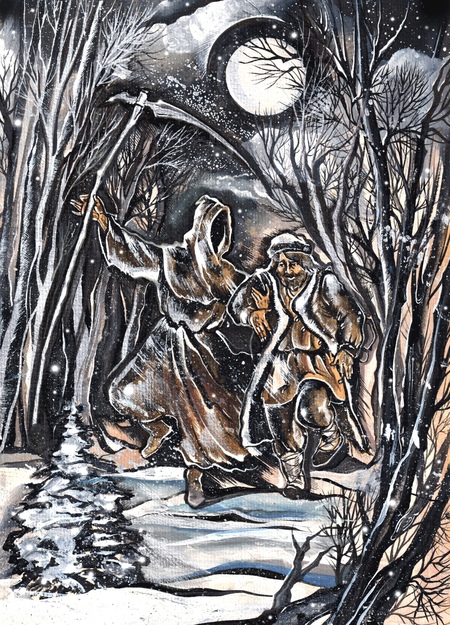 Веет зимний ветер, ночь темна, Скрипят и жалобно стонут липы, Скелеты, белея, выходят из тени, Мчатся и скачут в саванах длинных.