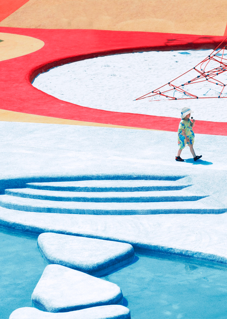 Тропы огибают водоем, повторяя его органические формы. Подобные изгибы и формы можно заметить и в дизайне детской площадки данного парка. Площадка ярко выделяется на фоне элегантной минималистичной органики за счет нежной цветовой палитры. Множество округлых форм и прямая доступность к миниатюрному водному аттракциону на территории площадки являются главной ее чертой.