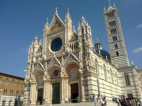 Фасад собора начали декорировать в XV столетии. Для этого использовали мрамор красного, зеленого и белого оттенка — в цвет итальянского флага. Но в XVI столетии из-за крупных хищений работы были остановлены. Полностью закончили облицовку фасада лишь в конце XIX века.