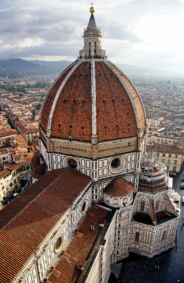 В результате Брунеллески сделал максимально легкую конструкцию, если так можно сказать о куполе из 4 миллионов кирпичей, весящем 40 000 тонн. За облицовочной красной черепицей и восемью ребрами из белого камня скрываются два слоя кирпичной кладки, между которыми располагается ниша с лестницей, ведущей на фонарную башенку (лантерну). Узор кладки Брунеллески предусмотрел таким образом, что кирпичи, расположенные под углом, поддерживают друг друга. Этот узор называют «елочка» или «рыбий хребет».