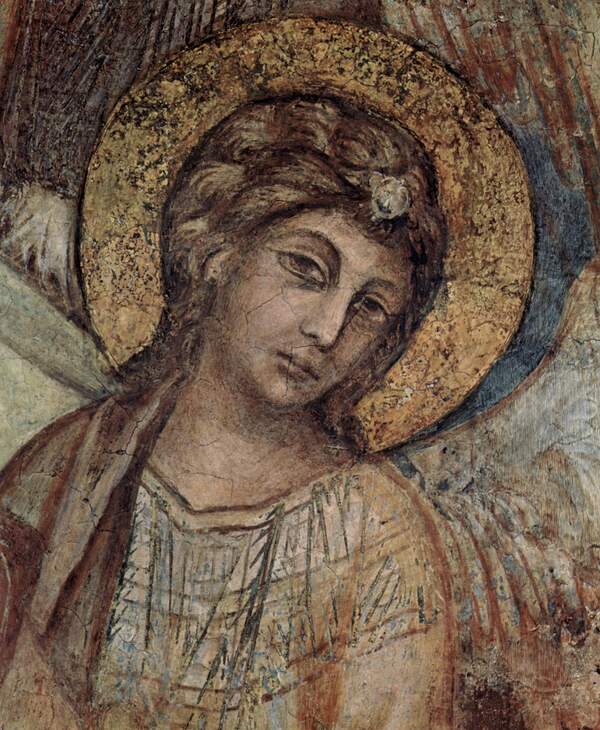 В отличие от Чимабуэ, у которого фигуры плоские и «втиснуты», Джотто придаёт вес, массу, реализм.